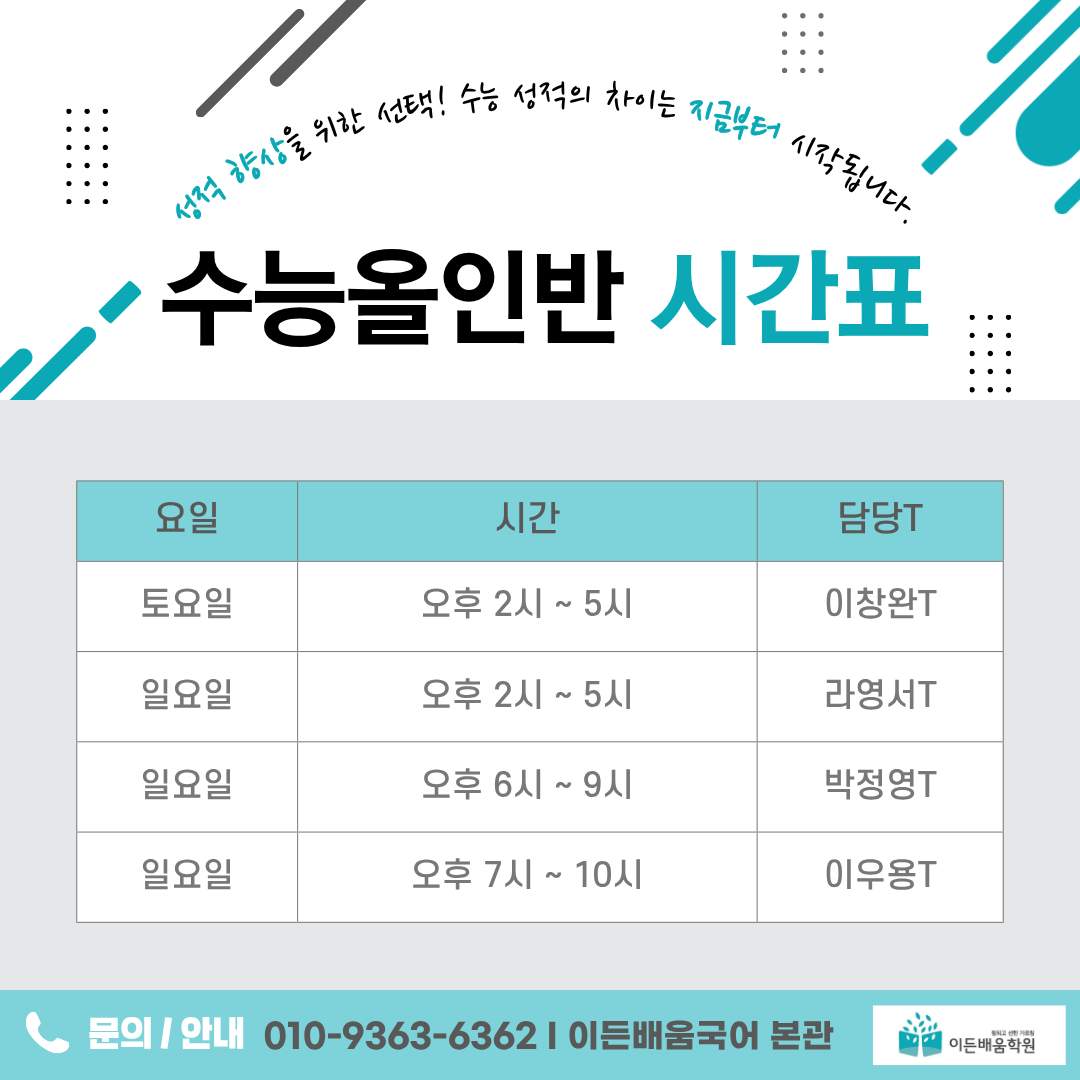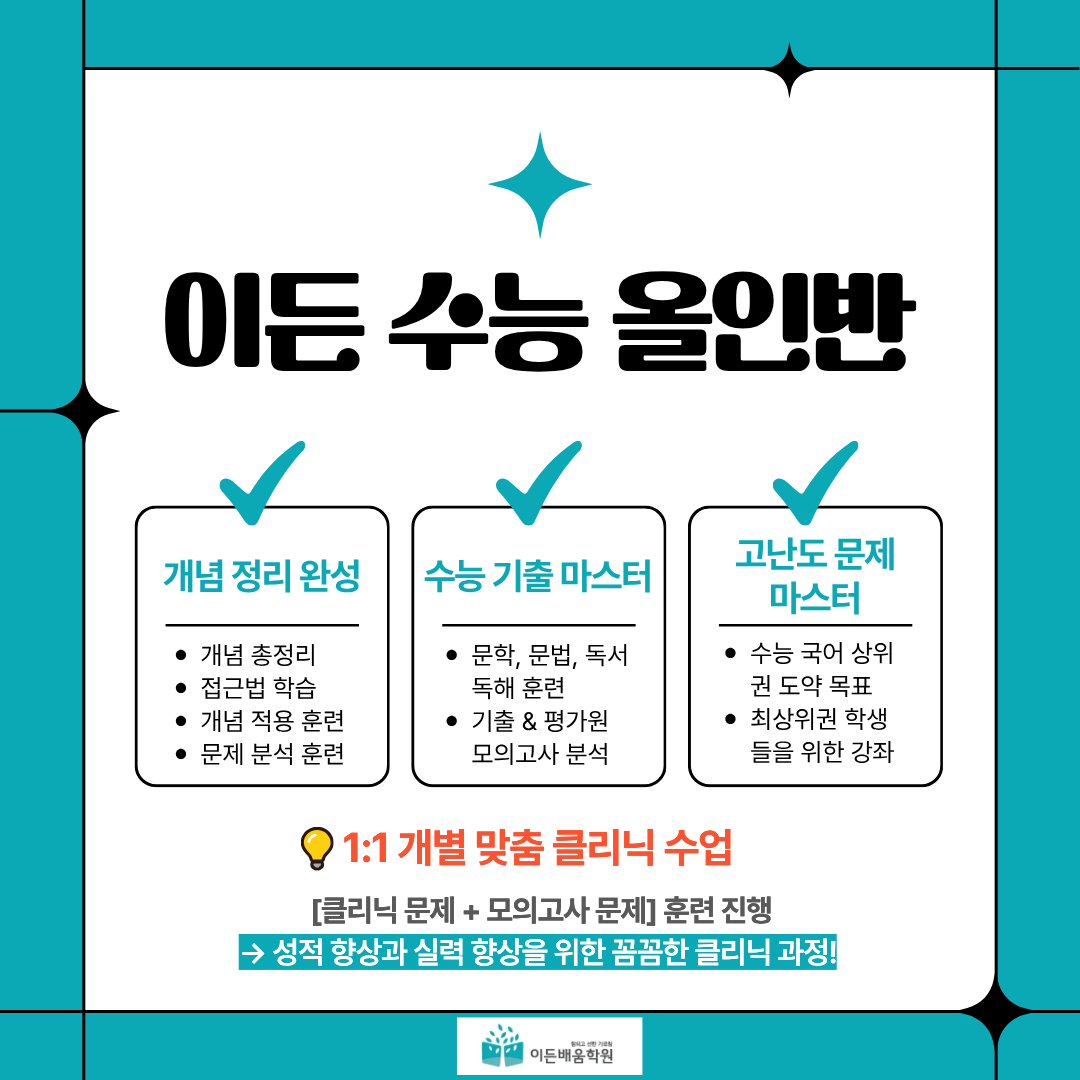 이든배움 국어학원이 자부하는 수능대비 노하우와 철저한 관리 프로그램을 바탕으로, 학생들이 수능시험에서 목표한 결과를 얻고 합격할 수 있도록 최선을 다해 지도하겠습니다. 고맙습니다.