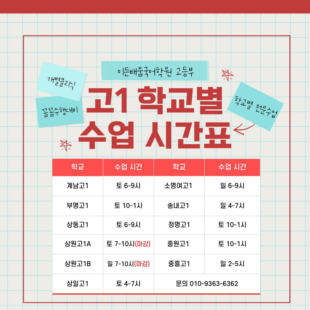 부천 상동 국어, 이든배움국어학원 2026 고1 1학기 중간고사 대비 학교별 수업 시간표 안내